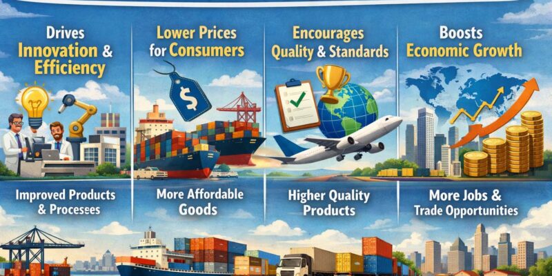Competition creates pressure for companies to become more efficient, innovative, and customer-focused. It also helps consumers by giving them more choices and better value. In international trade, competition influences pricing, quality standards, productivity, and long-term economic development.